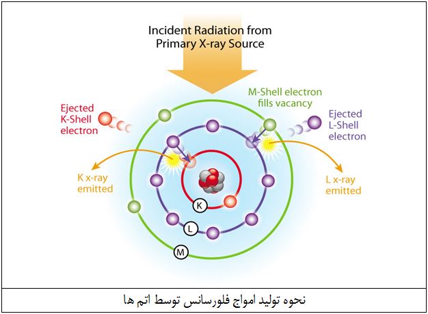 تشعشعات حاصل از تیوب مولد اشعه ایکس در دستگاه XRF به اتم های تشکیل دهنده نمونه برخورد نموده و باعث تولید امواج فلورسانس می گردد. در این فرآیند تشعشعات اولیه در اثر برخورد با اتم ها باعث خروج الکترون از ترازهای مختلف شده و اتم در حالت برانگیخته و ناپایدار قرار می گیرد. برای جبران الکترون خارج شده از اتم، الکترونی از ترازهای بالاتر به سمت ترازهای پایین تر (انرژی کمتر) منتقل می شود.