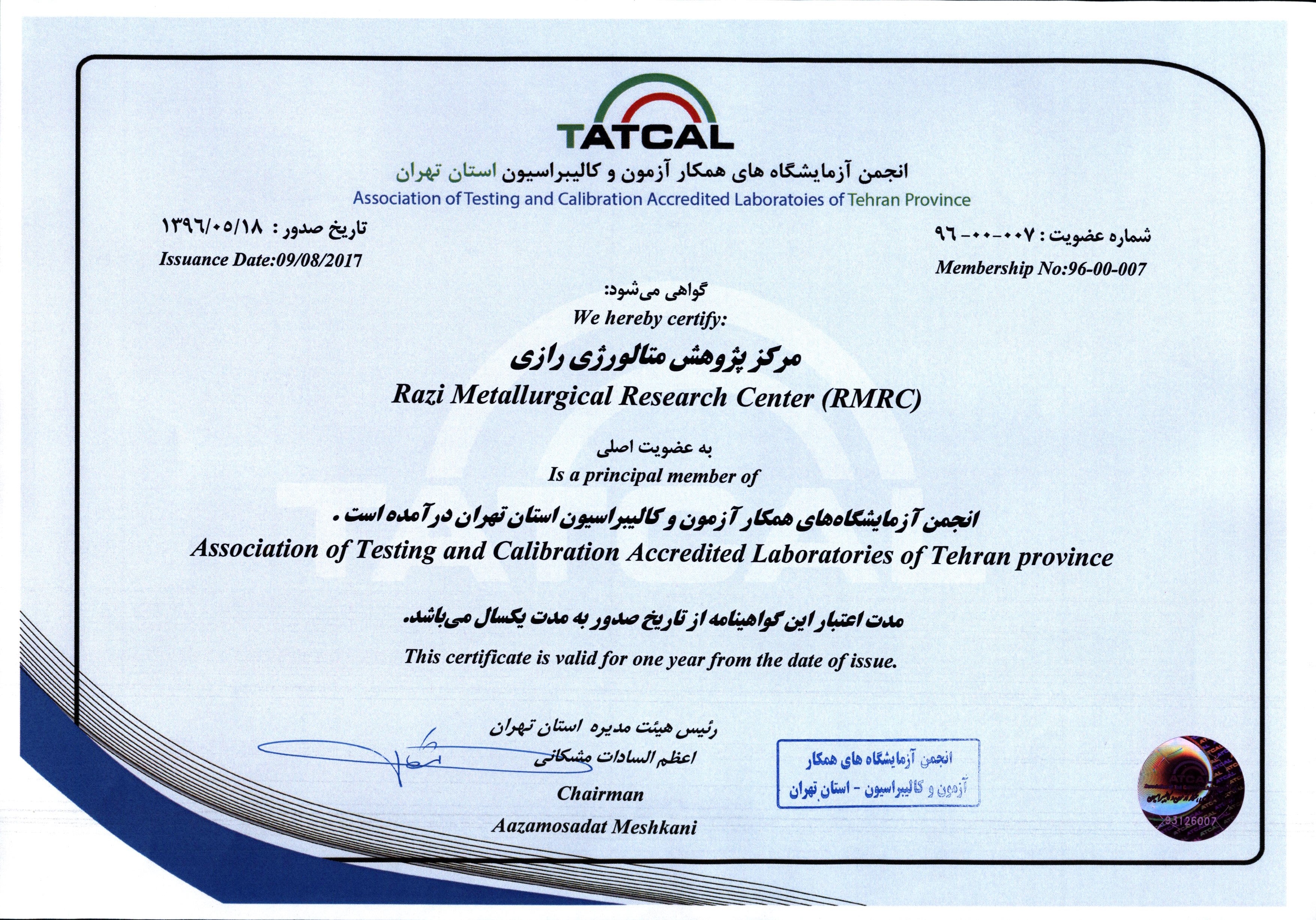 گواهینامه عضویت در انجمن آزمایشگاههای همکار آزمون و کالیبراسیون | اعتبار: 1397/05/18 دانلود JPG