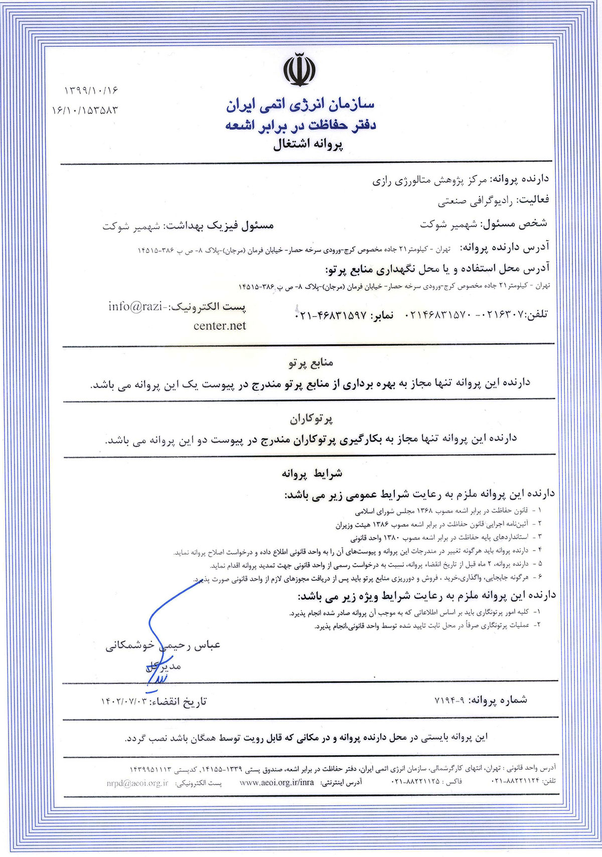 پروانه اشتغال از دفتر حفاظت در برابر اشعه سازمان انرژی اتمی ایران | اعتبار: 1402/07/03 دانلود JPG