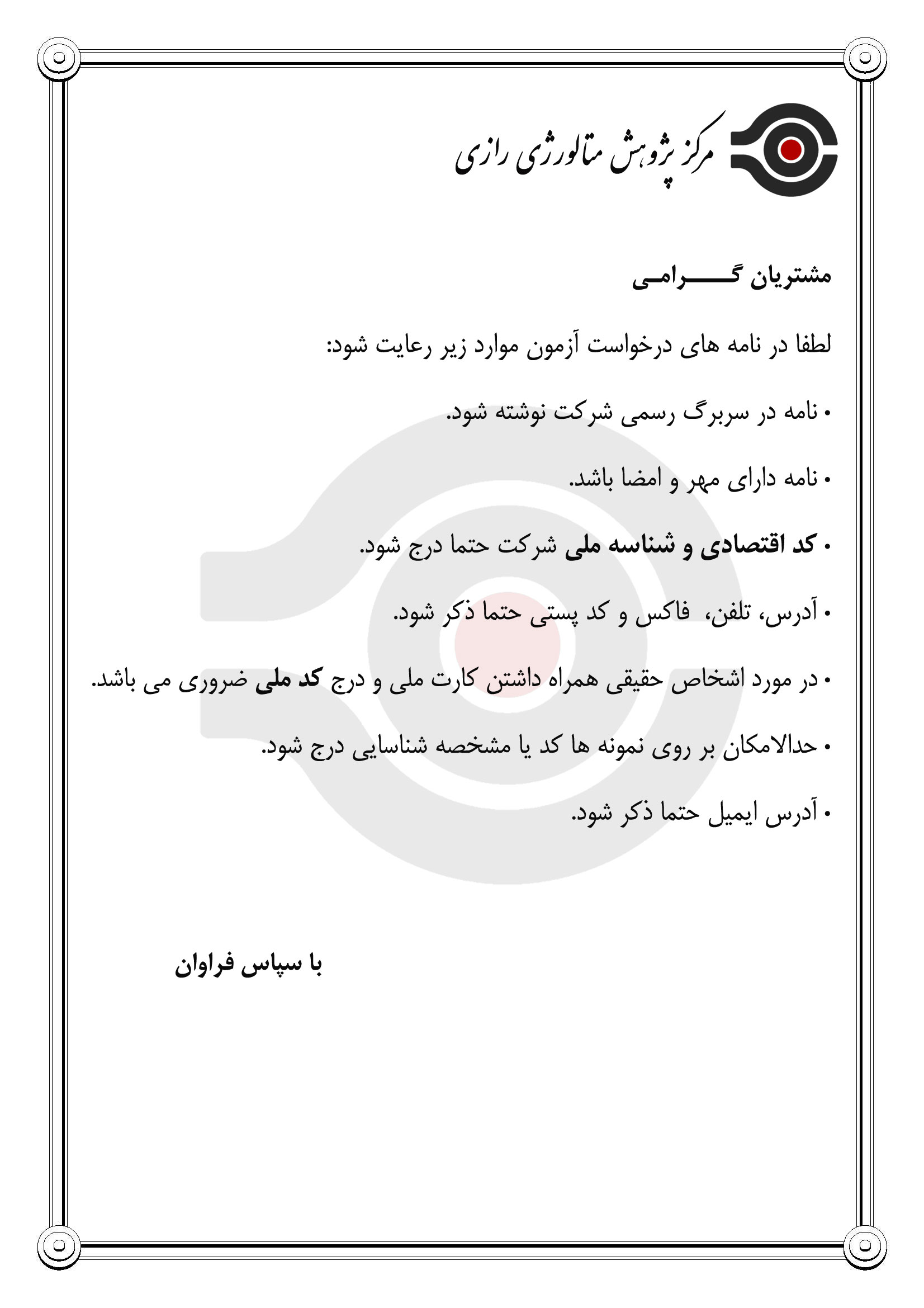 - مرکز پژوهش متالورژی رازی در قبال آزمون هایی که توضیحات ارسالی آن کامل و کتبی نباشد و همینطور توضیحات شفاهی، هیچ گونه مسئولیتی ندارد.